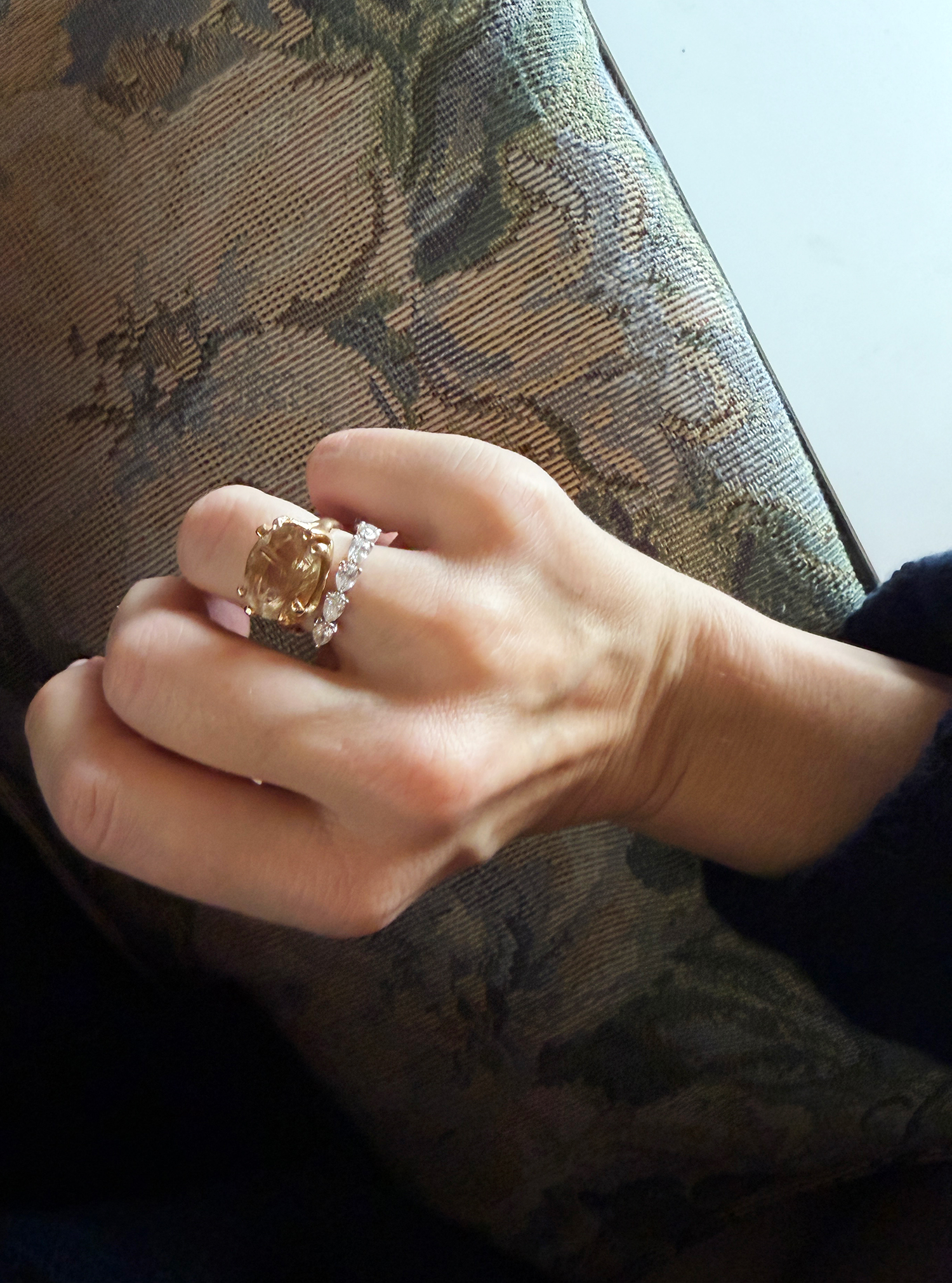 I ended up deciding on this beautiful pear diamond band for creating Hazel from scratch. I love her! And it looks so lovely with my Jane Pope quartz ring. I got this one as a gift when I announced my pregnancy, so feels like a good full circle duo. I also love that the stone is known for its healing energy, bringing balance, clarity, and overall health to those who wear it. I needed it this past year.